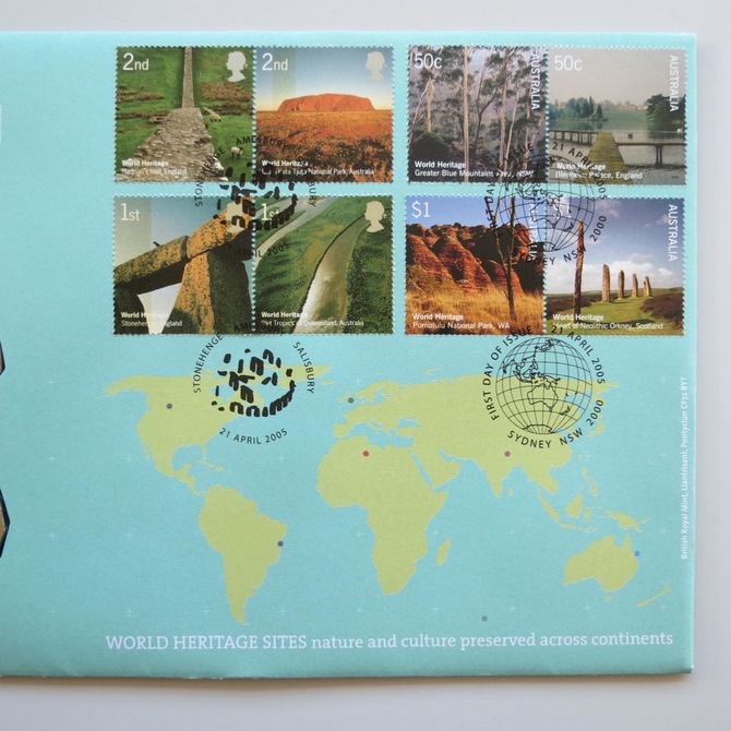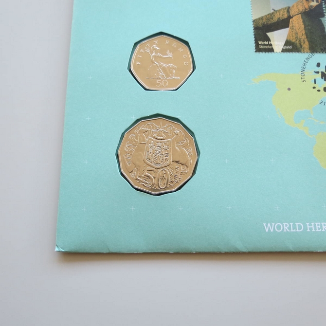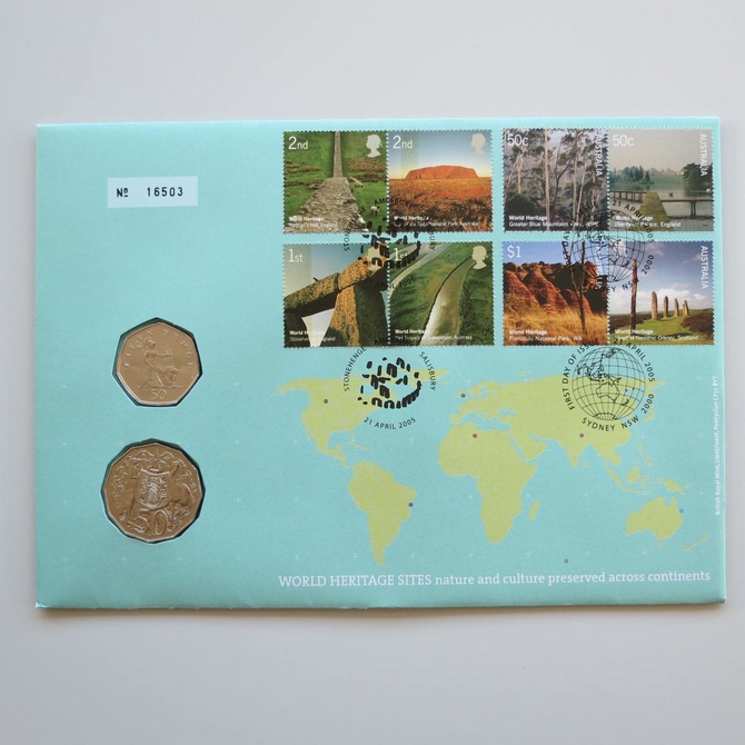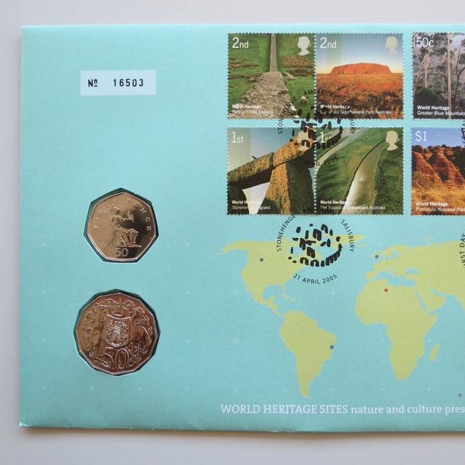 This 2005 World Heritage Sites 50p pence & 50c Cent coin cover is a Royal Mail first day cover. It celebrates nature and culture preserved across continents and hosts a brilliant uncirculated UK 50p pence coin and a Australian 50c cent coin together with Royal Mail stamps showing some World Heritage sites. Cancelled postmark First Day of Issue Sydney NSW 2000 & Stonehenge Amesbury Salisbury 21st April 2005.