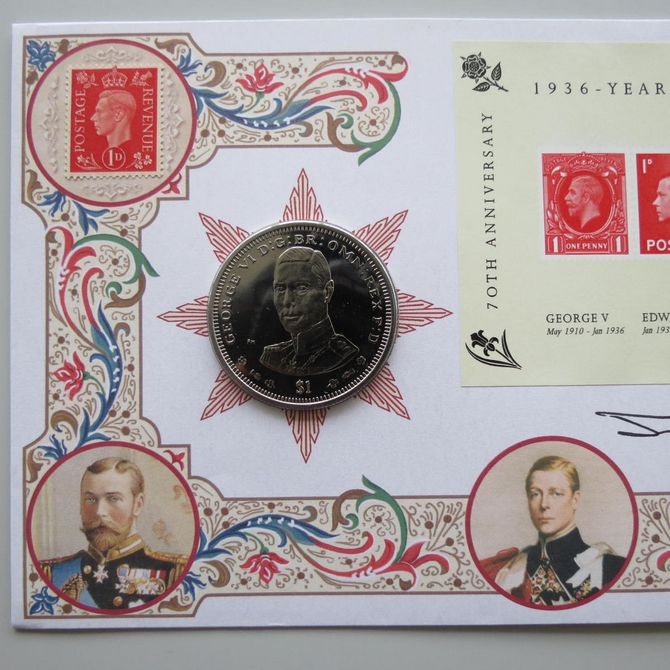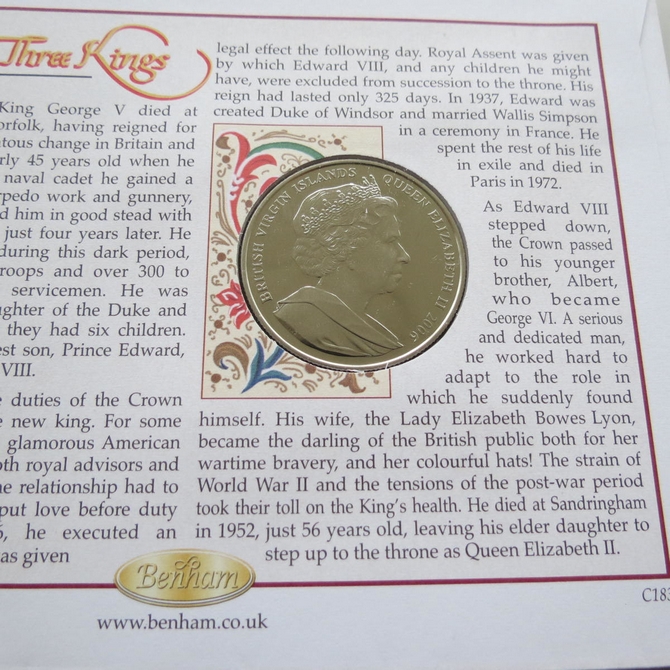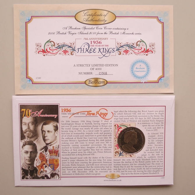 This 2006 1936 Year of Three Kings 1 Dollar coin cover is issued by Benham as signed UK PNC First Day Covers. FDC hand signed by Juliet Aubrey. It hosts a brilliant uncirculated one dollar coin by the Britrish Virgin Islands and Royal Mail stamps. Postmark cancelled dated 31st August 2006.