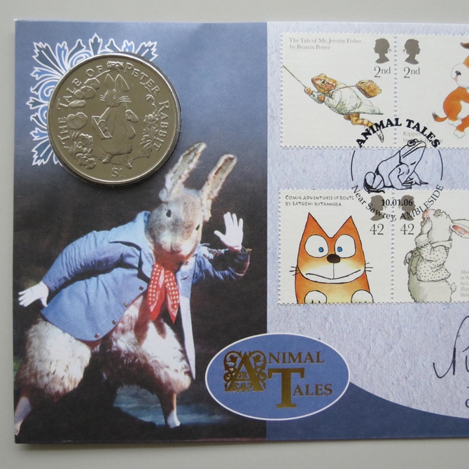 This 2006 Animal Tales 1 Dollar coin cover is issued by Benham as signed UK PNC First Day Covers. It hosts a brilliant uncirculated one dollar coin by British Virgin Islands and Royal Mail stamps. FDC hand signed by Penelope Wilton. Postmark cancelled dated 10th January 2006.