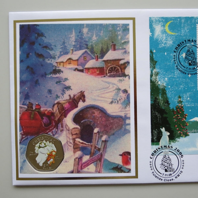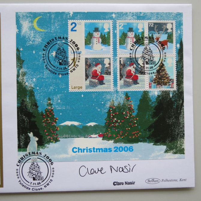 This 2006 Christmas The Snowman 50p pence coin cover is issued by Benham as signed UK PNC First Day Covers. It hosts a brilliant uncirculated fifty pence coin by the Isle of Man featuring The Snowman & James and Royal Mail stamps. FDC hand signed by Clare Nasir. Postmark cancelled dated 7th November 2006.