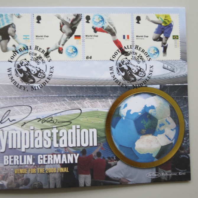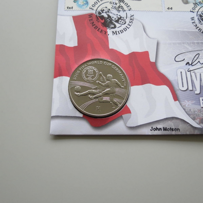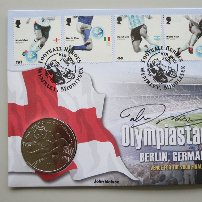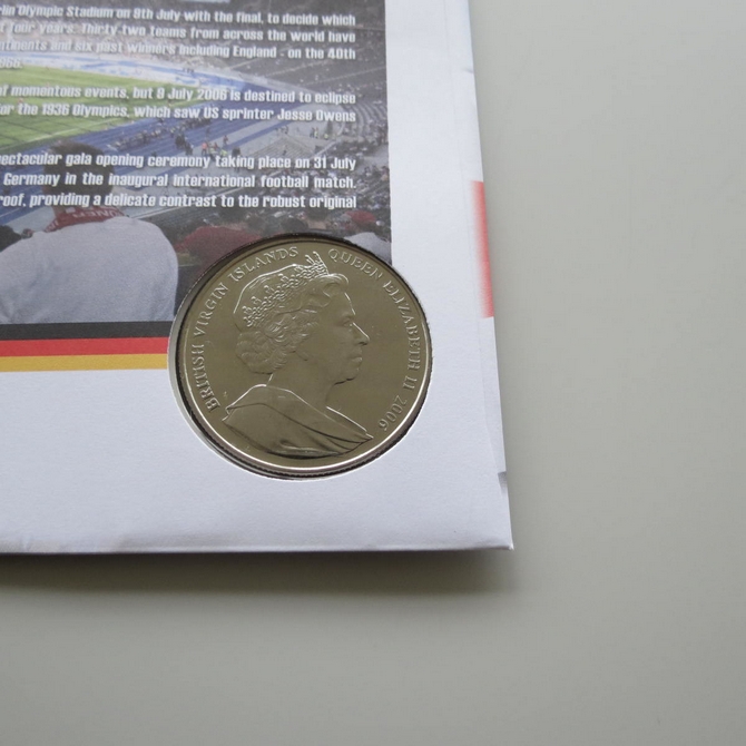 This 2006 Footbal World Cup Germany Olympiastadion 1 Dollar coin cover is issued by Benham as signed First Day Covers. FDC hand signed by John Motson. It hosts a brilliant uncirculated one dollar coin from British Virgin Islands and Royal Mail stamps. Postmark cancelled dated 6th June 2006.