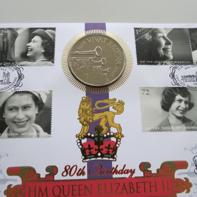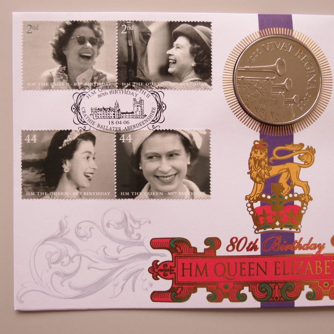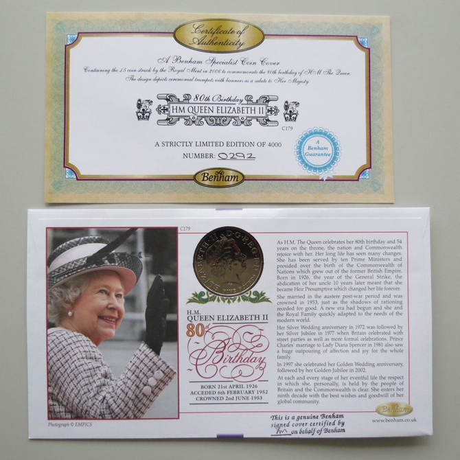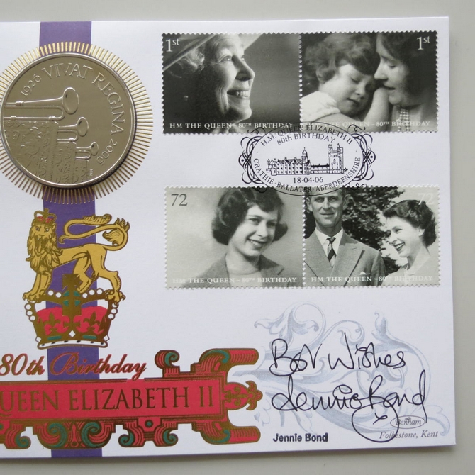 This 2006 HM Queen Elizabeth II 80th birthday 5 pounds coin cover is issued by Benham as signed First Day Covers. It hosts a brilliant uncirculated five pounds coin by the Royal Mint and Royal Mail stamps. FDC hand signed by Jennie Bond. Postmark cancelled dated 18th April 2006.