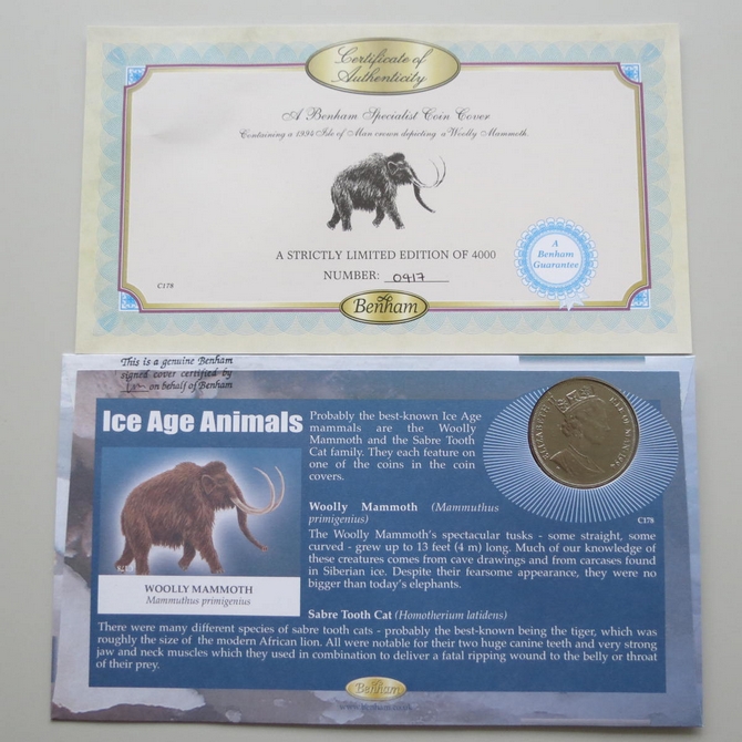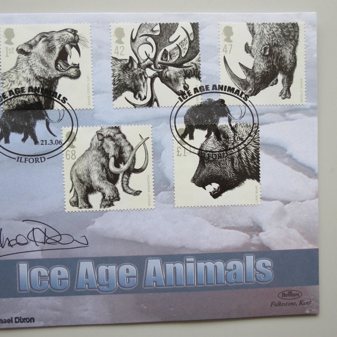 This 2006 Ice Age Animals 1 Crown coin cover is issued by Benham as signed UK PNC First Day Covers. It hosts a brilliant uncirculated Isle of Man one crown coin and Royal Mail stamps. FDC hand signed by Dr Michael Dixon. Postmark cancelled dated 21st March 2006.