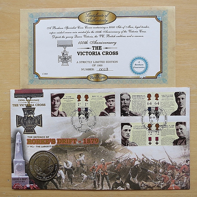 This 2006 The Victoria Cross 150th anniversary Isle of Man 1 crown coin cover is a Benham first day cover. It commemorates the 150th anniversary of the Victoria Cross and hosts a Isle of Man one crown coin and Royal Mail stamps showing people who were awarded the Victoria Cross for valour. The cover is named The Defence of Rorke's Drift 1879. Cancelled postmark The Victoria Cross Victoria Road Birmingham 21st September 2006.