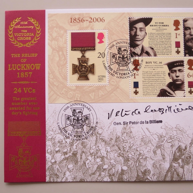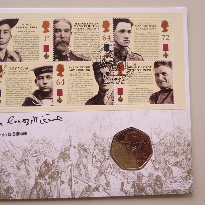 This 2006 Victoria Cross 150th anniversary 50p pence coin cover is issued by Benham as signed UK PNC First Day Covers. It hosts a brilliant uncirculated fifty pence coin by the Royal Mint and Royal Mail stamps. FDC hand signed by Ge.Sir Peter de la Billiere. Postmark cancelled dated 21st September 2006.