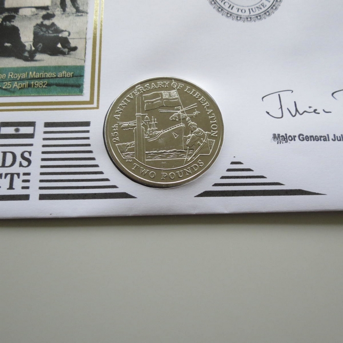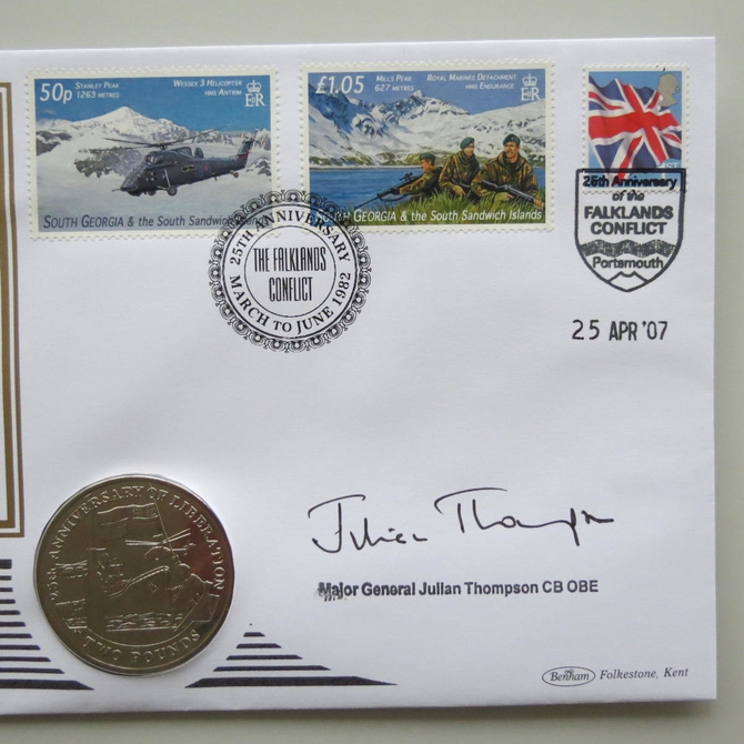 This 2007 25th anniversary of Falklands Conflict One Crown coin cover is issued by Benham as signed PNC First Day Covers. FDC hand signed by Major General Julian Thompson. It hosts a brilliant uncirculated one crown coin by South Georgia. Postmark cancelled dated 25th April 2007.
