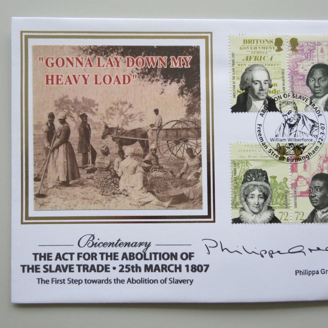 This 2007 Abolition of Slave Trade Act bicentenary Crown coin cover is issued by Benham as UK PNC First Day Covers. FDC hand signed by Philippa Gregory. It hosts a brilliant uncirculated one crown coin by the Isle of Man and Royal Mail stamps. Postmark cancelled dated 22nd March 2007.
