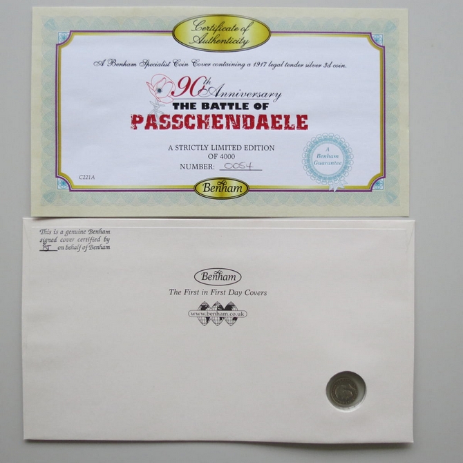 This 2007 Battle of Passchendaele 90th anniversary silver 3d coin cover is issued by Benham Covers as UK First Day Covers. It commemorates the WW1 Battle of Passchendaele and hosts a sterling silver 3d coin and Royal Mail stamps. Cancelled postmark Lest We Forget The Battle of Passchendaele The Strand London WC2 8th November 2007.