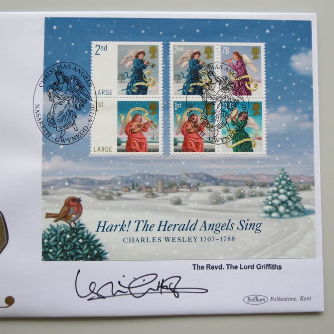 This 2007 Christmas Jewelled Light of Angels 50p coin cover is issued by Benham as signed UK PNC First Day Covers. FDC signed by Lord Griffiths. It hosts a brilliant uncirculated fifty pence coin by the Isle of Man and Royal Mail stamps. Postmark cancelled dated 6th November 2007.