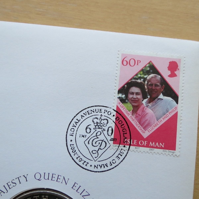 This 2007 HM QEII diamond wedding anniversary 1 dollar coin cover is a Isle of Man first day cover by Mercury. It marks the 60 years wedding anniversary of Her Majesty and HRH Prince Philip and hosts a 1 dollar Cook Islands coin and a pink stamp. Cancelled postmark Royal Avenue PO Douglas Isle of Man 22nd February 2007.