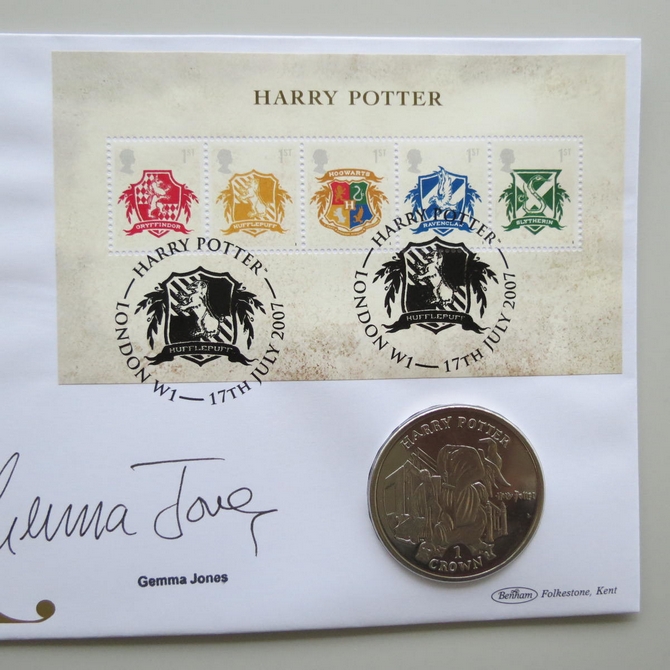 This 2007 Harry Potter 1 Crown coin cover is issued by Benham as signed UK PNC First Day Covers. FDC hand signed by Gemma Jones. It hosts a brilliant uncirculated one crown coin by the Isle of Man and Royal Mail stamps. Postmark cancelled dated 17th July 2007.