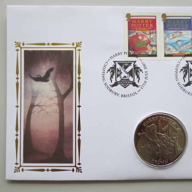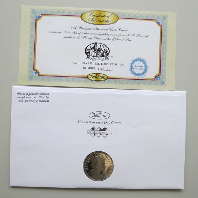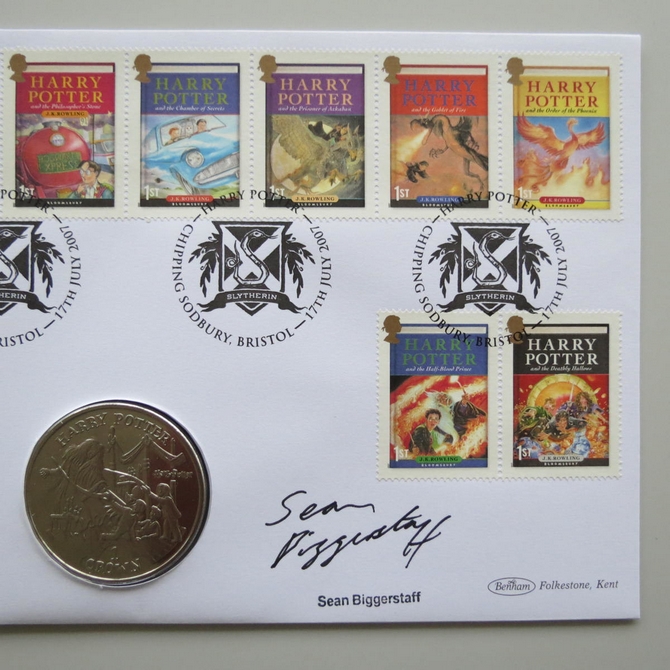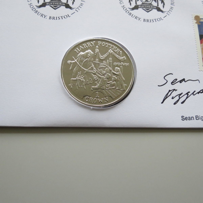 This 2007 Harry Potter Hogwarts Crown coin cover is issued by Benham as signed UK PNC First Day Covers. FDC hand signed by Sean Biggerstaff. It hosts a brilliant uncirculated one crown coin from the Isle of Man and Royal Mail stamps. Postmark cancelled dated 17th July 2007.