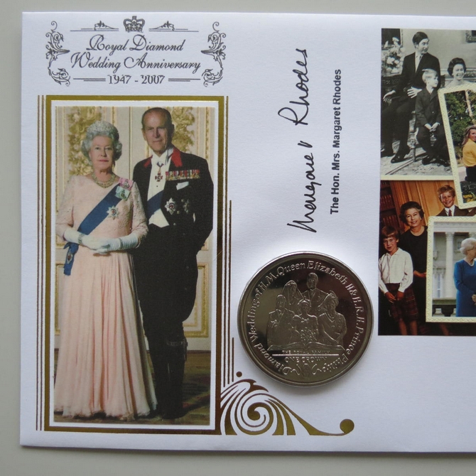This 2007 Royal Diamond Wedding anniversary 1 Crown coin cover is issued by Benham as signed First Day Covers. FDC hand signed by Margaret Rhodes. It hosts a brilliant uncirculated one crown coin by the Isle of Man and Royal Mail stamps. Postmark cancelled dated 16th October 2007.