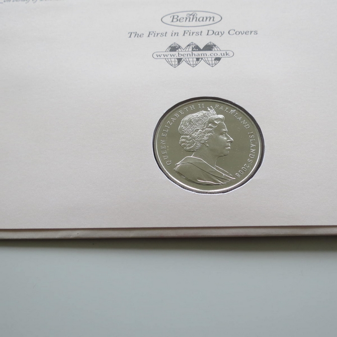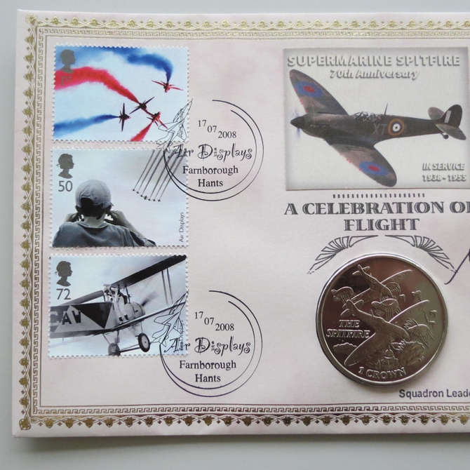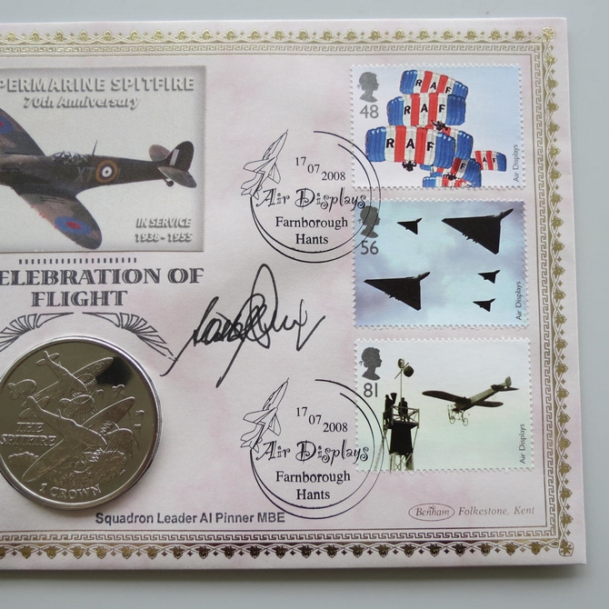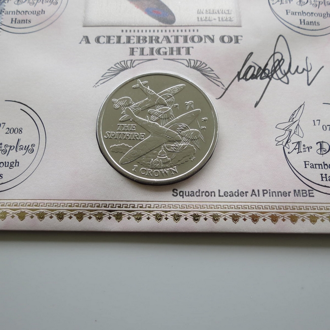 This 2008 A Celebration of Flight Crown coin cover is issued by Benham as UK PNC First Day Covers. FDC hand signed by Squadron Leader Al Pinner. It hosts a brilliant uncirculated one crown coin by Falkland Islands and Royal Mail stamps. Postmark cancelled dated 17th July 2008.