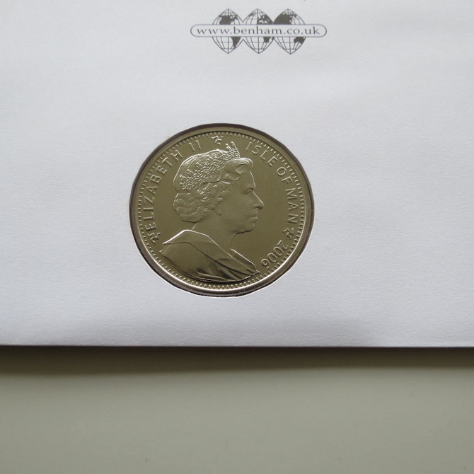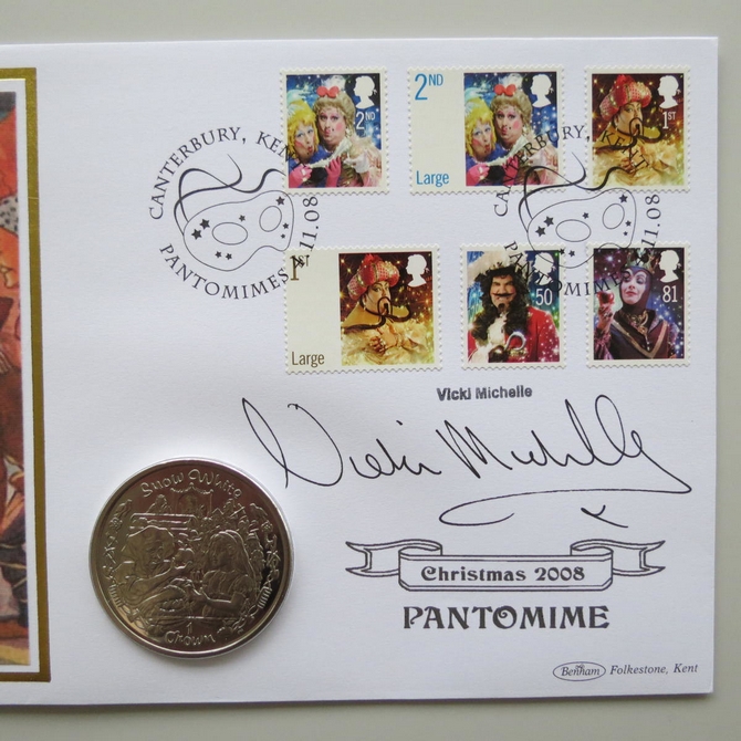This 2008 Christmas Pantomime 1 Crown coin cover is issued by Benham as UK PNC First Day Covers. FDC hand signed by Vicki Michelle. It hosts a brilliant uncirculated one crown coin the Isle of Man and Royal Mail stamps. Postmark cancelled dated 4th November 2008.