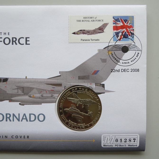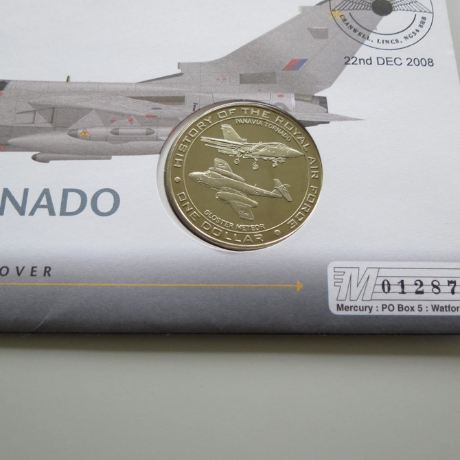 This 2008 History of the Royal Air Force Panavia Tornado 1 Dollar coin cover is issued by UK as PNC First Day Covers. It commemorates the history of the RAF and hosts a brilliant uncirculated one dollar coin depicting the Tornado and the Gloster Meteor war planes and a Royal Mail stamp. Cancelled postmark dated 22nd Dec 2008.