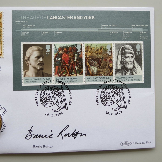 This 2008 The House of York Edward IV Angel coin cover is issued by Benham as UK PNC First Day Covers. FDC hand signed by Barrie Rutter. It hosts replica hammered gold angel coin and Royal Mail stamps. Postmark cancelled dated 28th February 2008.