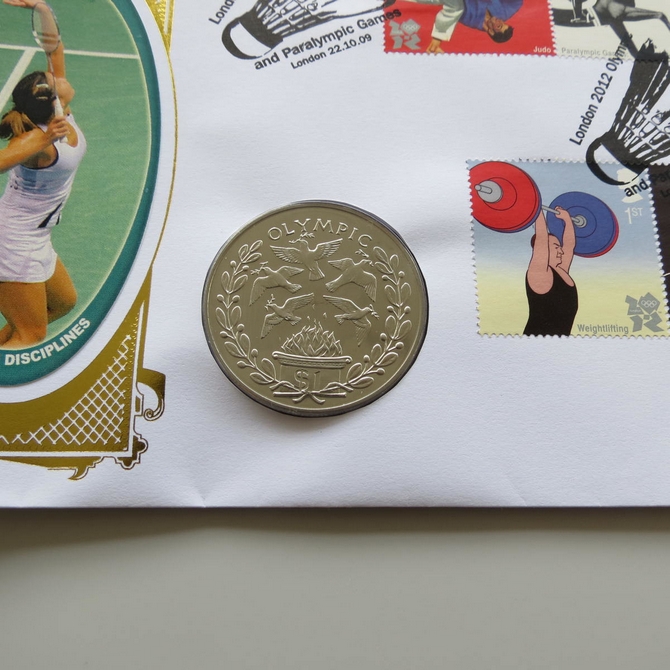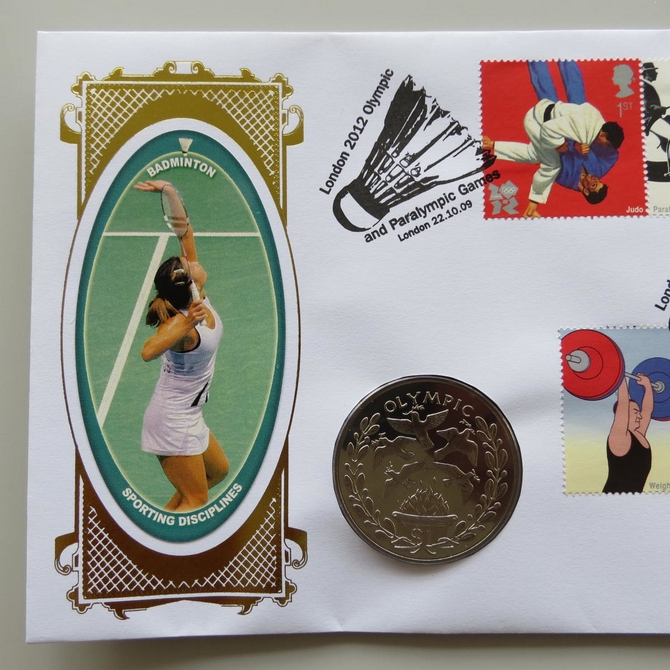 This 2009 Badminton London 2012 Olympics 1 Dollar coin cover is issued by Benham as UK PNC First Day Covers. FDC hand signed by Andy Allford. It hosts a brilliant uncirculated one dollar coin by Sierra Leone and Royal Mail stamps. Poskmark cancelled 22nd October 2009.