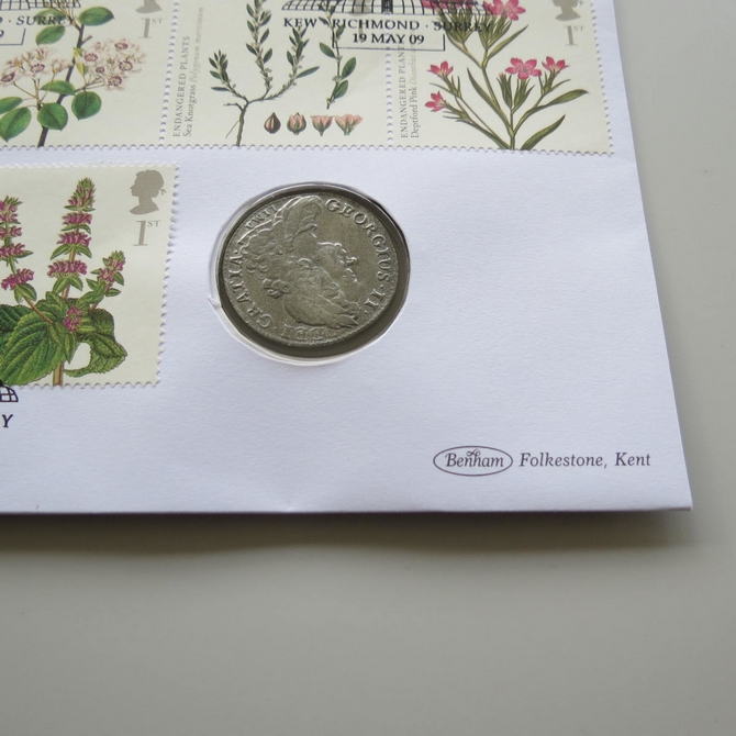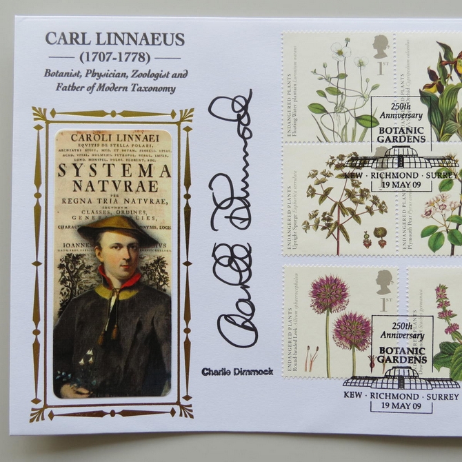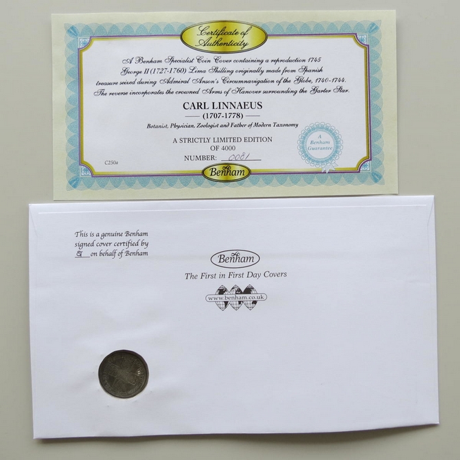 This 2009 Carl Linnaeus botanic gardens Lima Shilling coin cover is issued by Benham as UK PNC First Day Covers. FDC hand signed by Charlie Dimmock. It hosts a reproduction 1745 Lima shilling and Royal Mail stamps. Poskmark cancelled 19th May 2009.