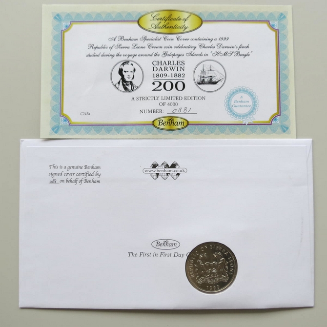 This 2009 Charles Darwin birth bicentenary 1 Dollar coin cover is issued by Benham as UK PNC First Day Covers. FDC hand signed by Henry Nicholls. It hosts a brilliant uncirculated one dollar coin by Sierra Leone and Royal Mail stamps. Poskmark cancelled 12th February 2009.