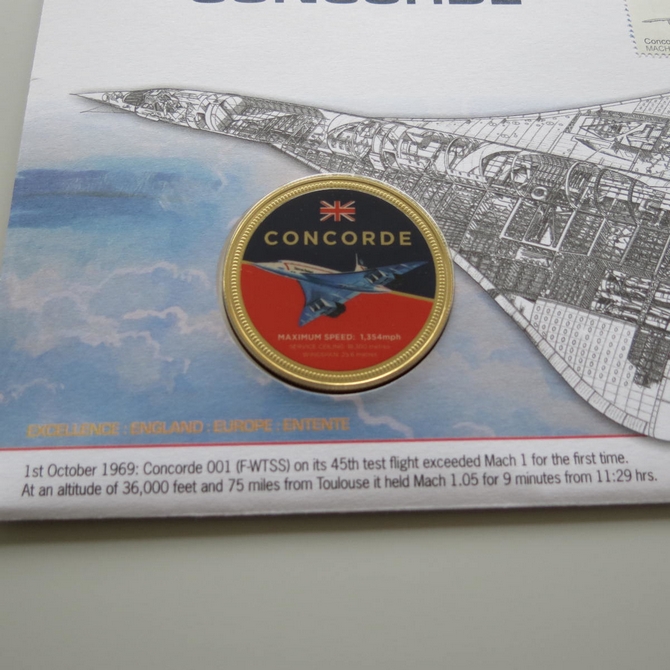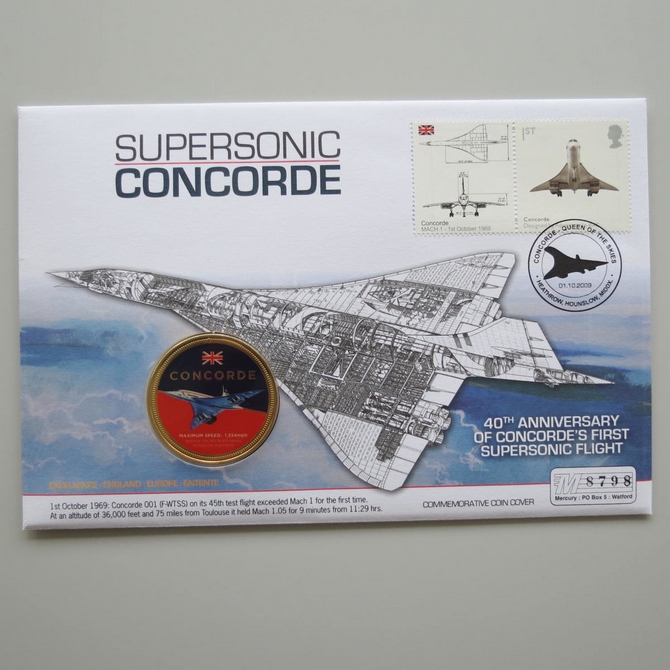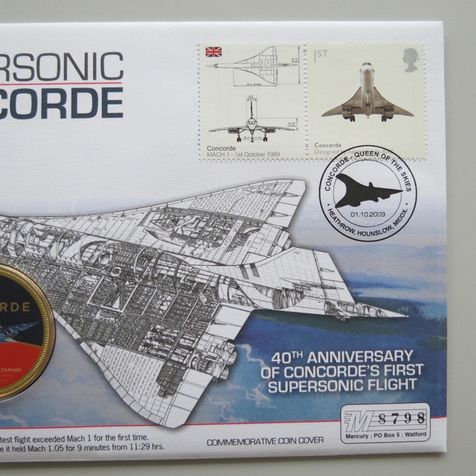 This 2009 Supersonic Concorde 40th anniversary medal cover is issued in UK as PNC First Day Covers. It hosts a medal celebrating 40 years of Concorde's 1st supersonic flight. Comes presented on a card complete with a certification of authenticity. Postmark cancelled dated 1st October 2009.