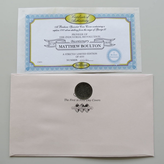 This 2009 The Industrial Revolution silver shilling coin cover celebrates Matthew Boulton bicentenary.It's issued by Benhams as a signed UK PNC First Day Covers. It hosts a replica 1787 silver shilling and Royal Mail stamps. Poskmark cancelled 10th March 2009.