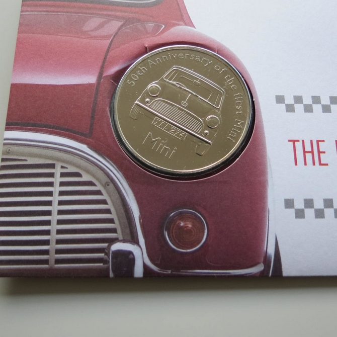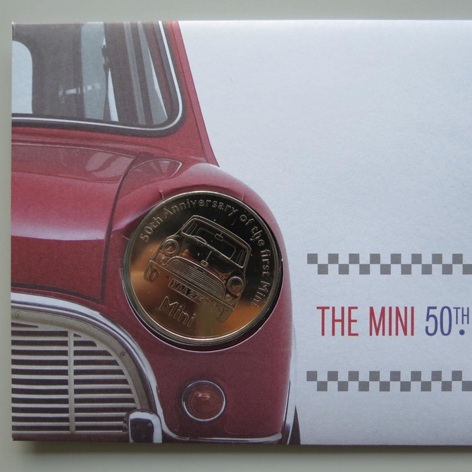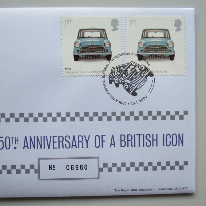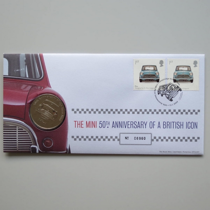 This 2009 The Mini 50th anniversary medal cover is issued in the UK as Royal Mail PNC first day covers. It hosts a medal celebrating 50 years of the classic supermini car and Royal Mail commemorative stamps showing the original Mini car designed by Sir Alec Issigonis. Cancelled postmark 50th Anniversary of the Mini Longbridge Birmingham 13th January 2009.
