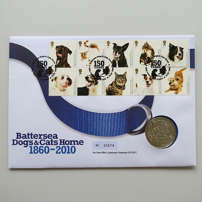 This 2010 Battersea dogs & cats home medal cover is a Royal Mail first day cover. It celebrates 150 years of Battersea animal home helping cats and dogs in need and hosts a medal by the Royal Mint and Royal Mail stamp cachet showing pictures of different breeds of cats and dogs that have been cared for in the home. Cancelled postmark Battersea Dogs & Cats Home 1860 - 2010 London SW8 1st March 2010.
