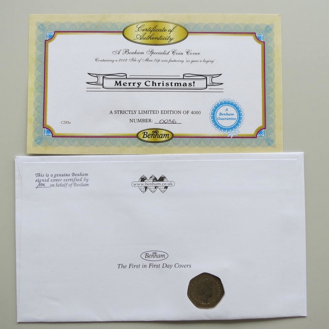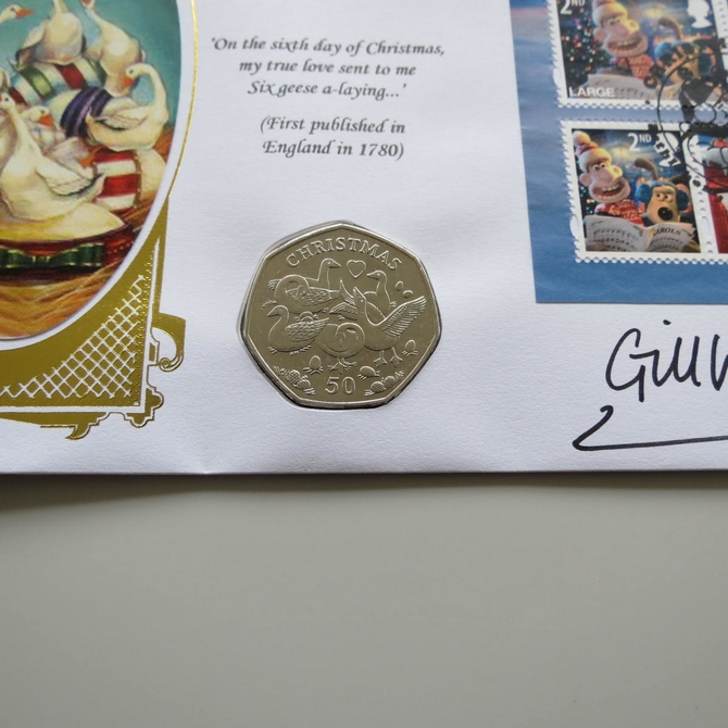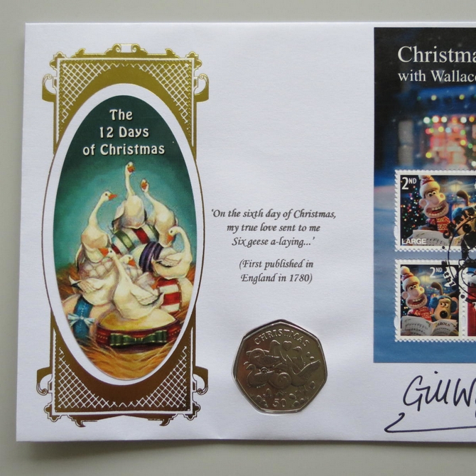 This 2010 Christmas with Wallace and Gromit 50p pence coin cover is issued by Benham as UK PNC First Day Covers. FDC hand signed by Gill Wright. It hosts a brilliant uncirculated fifty pence coin by the Isle of Man featuring Geese and Royal Mail stamps. Postmark cancelled dated 2nd November 2010.