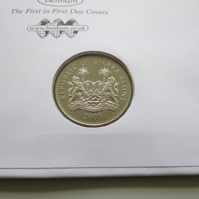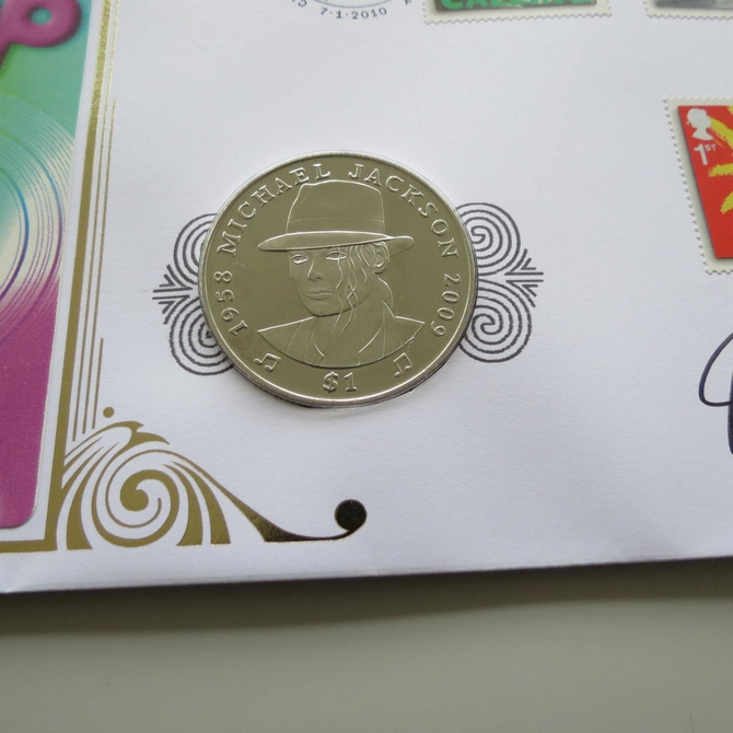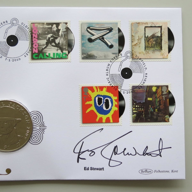 This 2010 Classic Album Covers Pop music 1 Dollar coin cover is issued by Benham as UK PNC First Day Covers. FDC hand signed by Ed Stewart. It hosts a brilliant uncirculated one dollar coin by Sierra Leone showing a portrait of Michael Jackson and Royal Mail stamps. Postmark cancelled dated 7th January 2010
