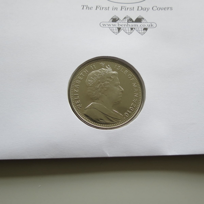 This 2010 Cycling Countdown to London 2012 Olympics Crown coin cover is issued by Benham as UK PNC First Day Covers. FDC hand signed by Chris Boardman. It hosts a brilliant uncirculated one crown coin by the Isle of Man and Royal Mail stamps. Postmark cancelled dated 27th July 2010