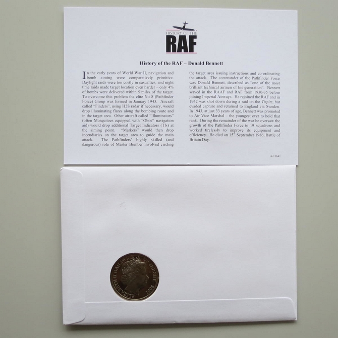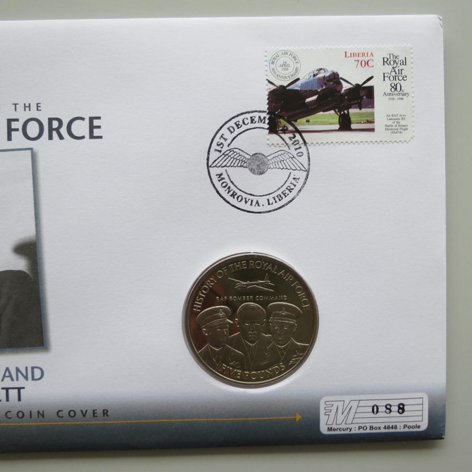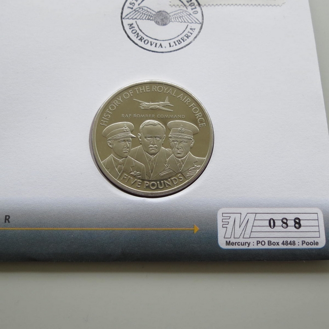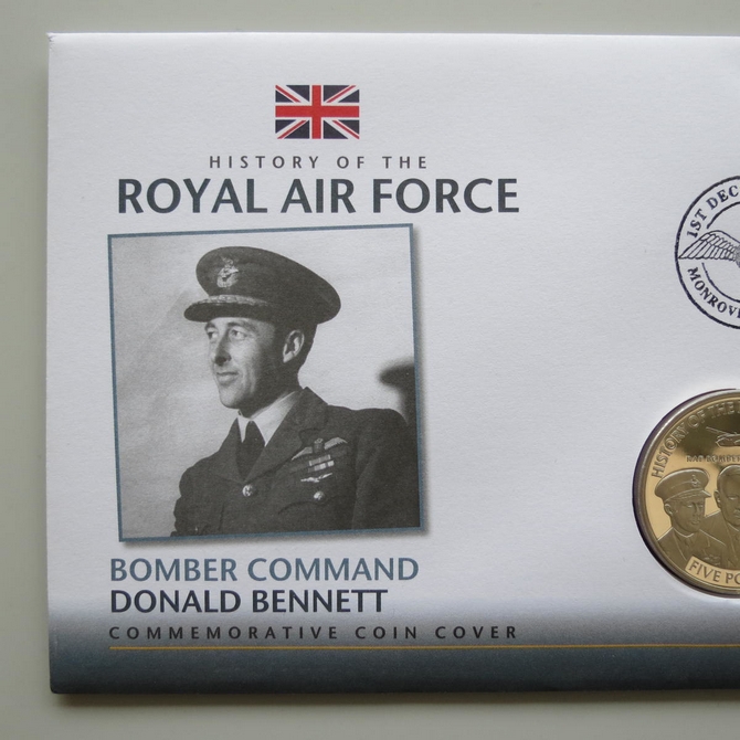This 2010 History of the RAF Bomber Command Donald Bennett 5 Pounds coin cover is issued by Liberia as PNC First Day Covers. It reflects on the Royal Air Force's Bomber Command and Commander Bennett and hosts a brilliant uncirculated five pounds coin and a stamp. Cancelled postmark dated 1st December 2010.