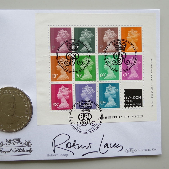 This 2010 King George V Royal Philately 1 Dollar coin cover is issued by Benham as UK PNC First Day Covers. FDC hand signed by Robert Lacey. It hosts a brilliant uncirculated one dollar coin by the British Virgin Islands and Royal Mail stamps. Postmark cancelled dated 8th May 2010.