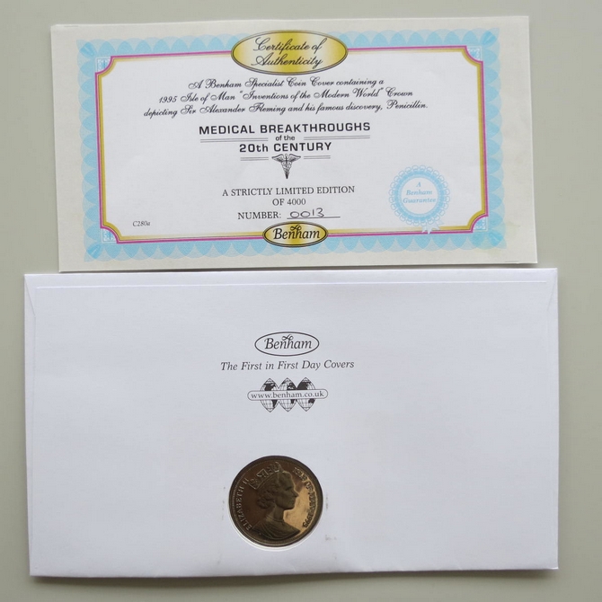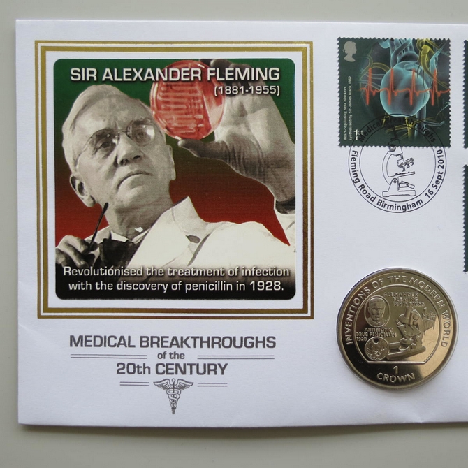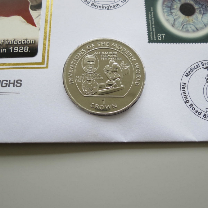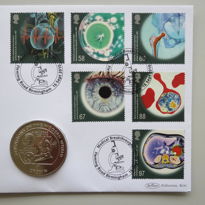 This 2010 medical breakthroughs in the 20th century 1 crown coin cover is a Benham first day cover. It celebrates medical inventions of the modern world and hosts a brilliant uncirculated Isle of Man one crown and Royal Mail stamps depicting the medical breakthroughs. Cancelled postmark Medical Breakthroughs Fleming Road Birmingham 16th September 2010.