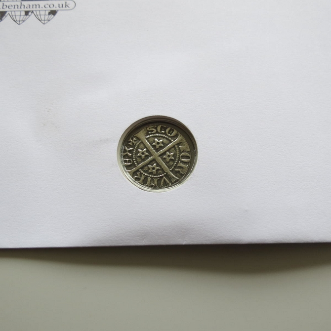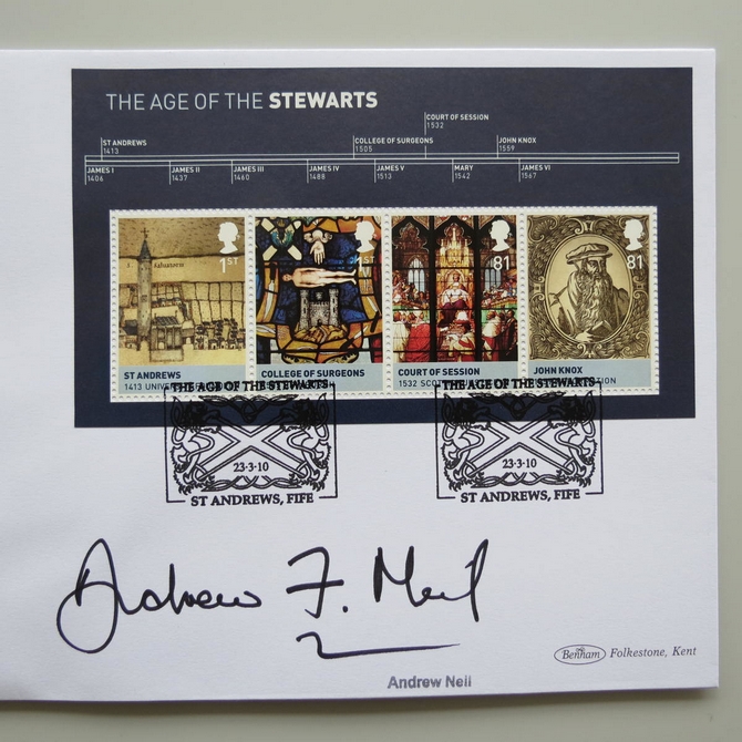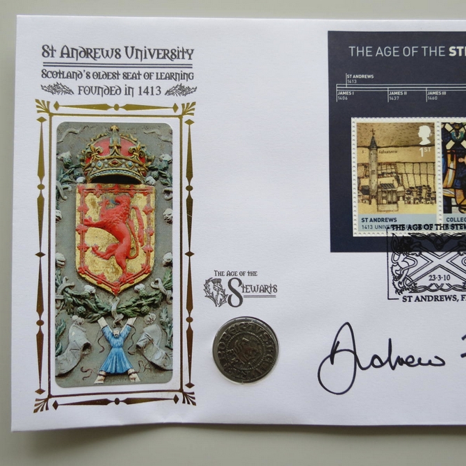This 2010 The Age of the Stewarts St Andrews University coin cover is issued by Benham as UK PNC First Day Covers. FDC hand signed by Andrew Neil. It hosts a reproduction silver penny during reign of Robert the Bruce and Royal Mail stamps. Postmark cancelled dated 23rd March 2010.