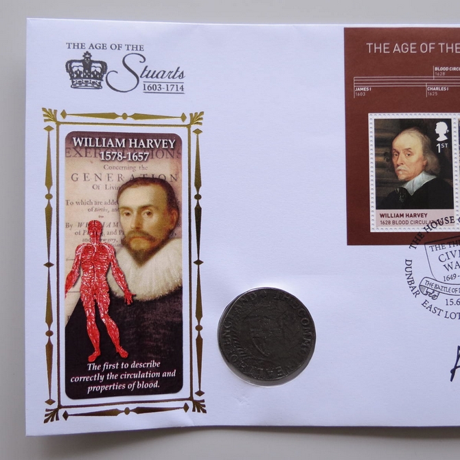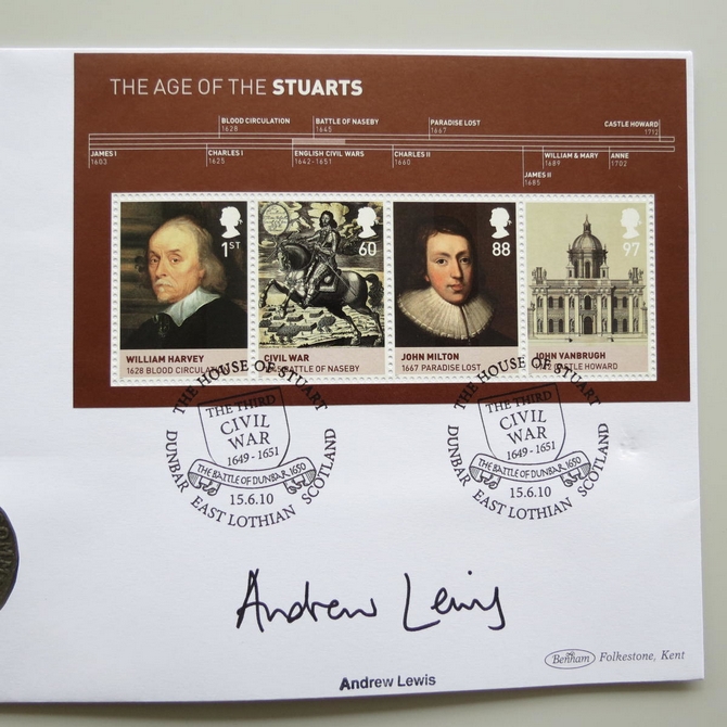 This 2010 The Age of the Stuarts Shilling coin cover is issued by Benham as UK PNC First Day Covers. FDC hand signed by Andrew Lewis. It hosts a reproduction 1653 Commonwealth shilling and Royal Mail stamps. Postmark cancelled dated 15th June 2010.