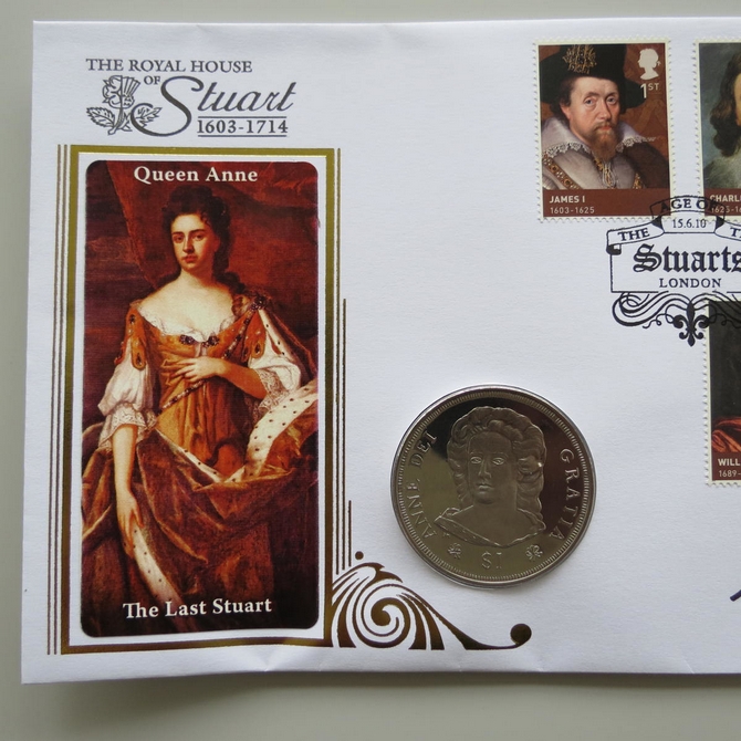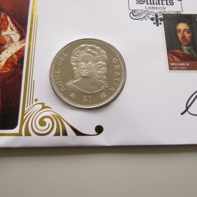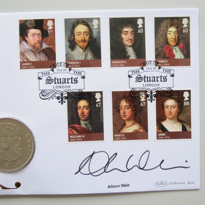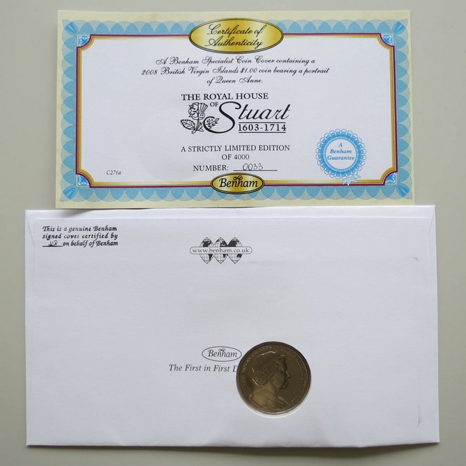 This 2010 The Royal House of Stuart 1 Dollar coin cover is issued by Benham as UK PNC First Day Covers. FDC hand signed by Alison Weir. It hosts a brilliant uncirculated one dollar coin by the British Virgin Islands and Royal Mail stamps. Postmark cancelled dated 15th June 2010.