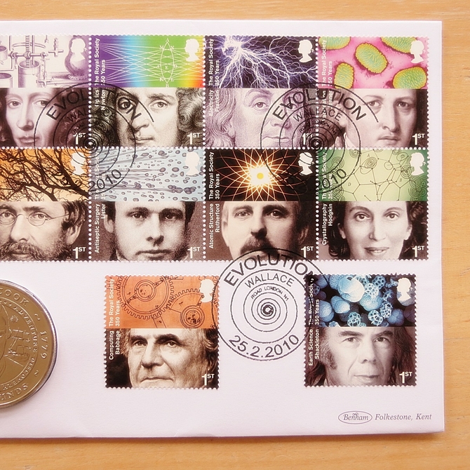 This 2010 The Royal Society 350th Anniversary 2 pounds coin cover is a Benham first day cover. It celebrates the 350 years of the Royal Society and hosts a brilliant uncirculated two pounds coin depicting James Cook and Royal Mail stamps showing the many contributors to the Royal Society. Cancelled postmark Evolution Wallace Road London 25th February 2010.