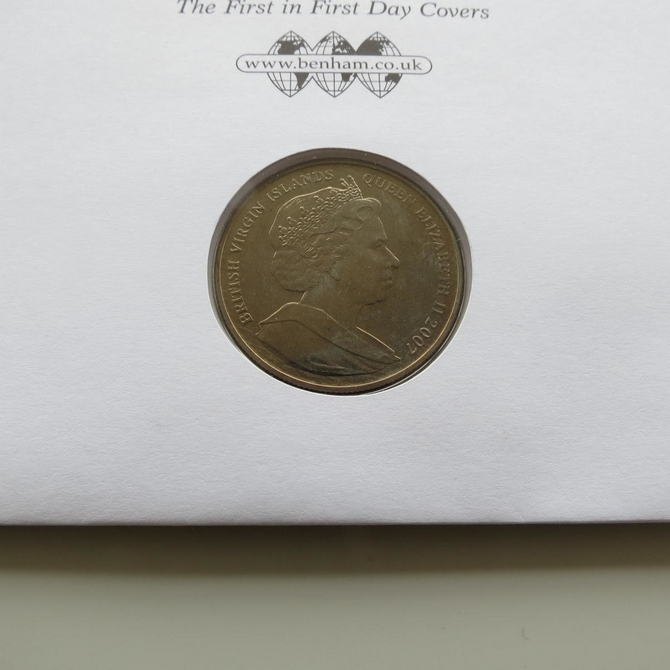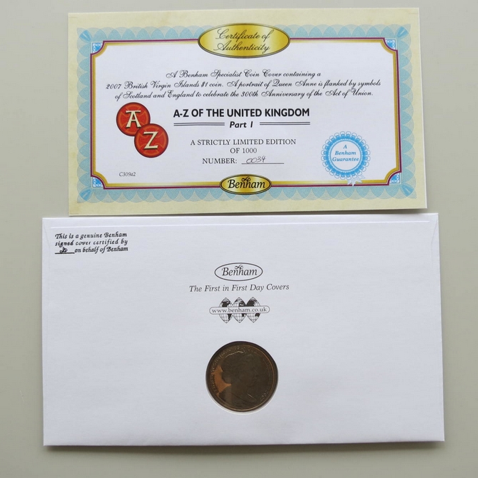 This 2011 A to Z of the United Kingdom 1 Dollar coin cover is issued by Benham as UK PNC First Day Covers. FDC hand signed by Neil Oliver. It hosts a brilliant uncirculated one dollar coin by the British Virgin Islands and Royal Mail stamps. Postmark cancelled dated 13th October 2011.