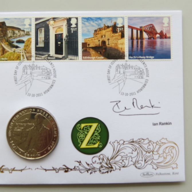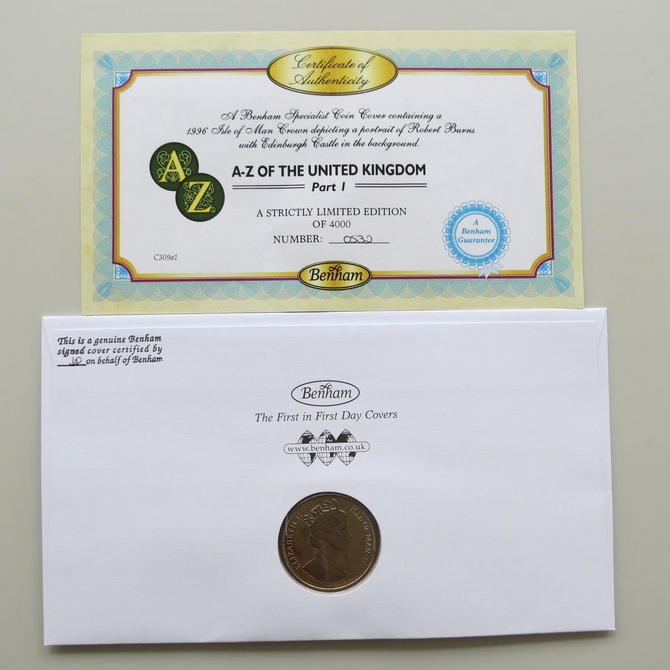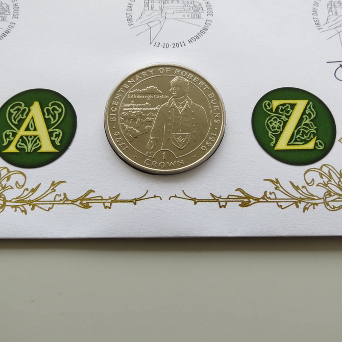 This 2011 A to Z of the United Kingdon 1 Crown coin cover is issued by Benham as UK PNC First Day Covers. FDC hand signed by Ian Rankin. It hosts a brilliant uncirculated one crown coin by the Isle of Man and Royal Mail stamps. Postmark cancelled dated 13th October 2011.