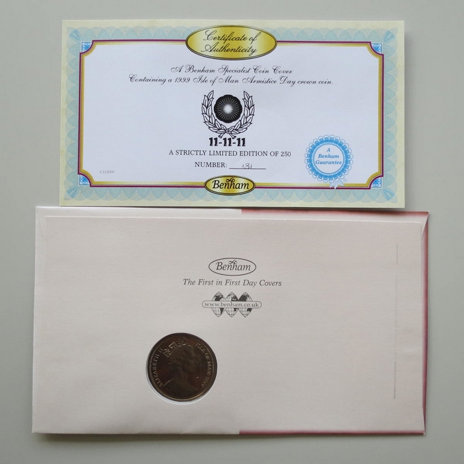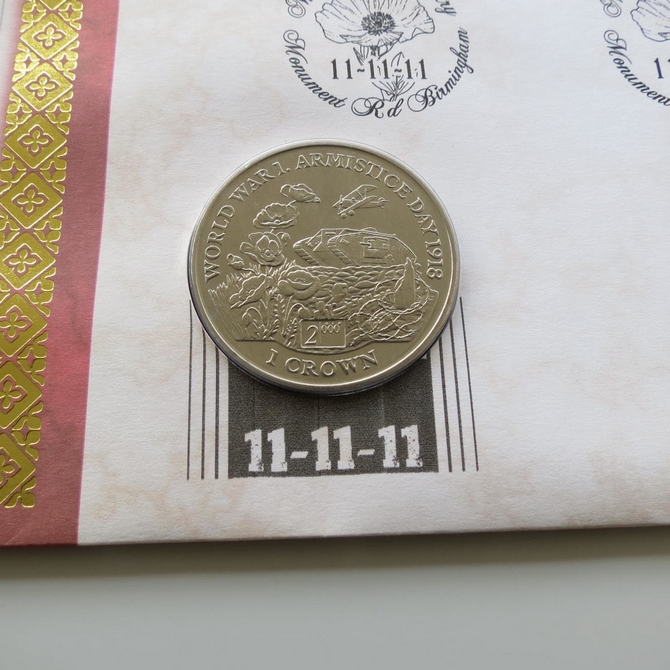 This 2011 Armistice Day 1 Crown coin cover is issued by Benham as UK PNC First Day Covers. It hosts a brilliant uncirculated one crown coin by the Isle of Man and Royal Mail stamps. Postmark cancelled dated 11th November 2011.