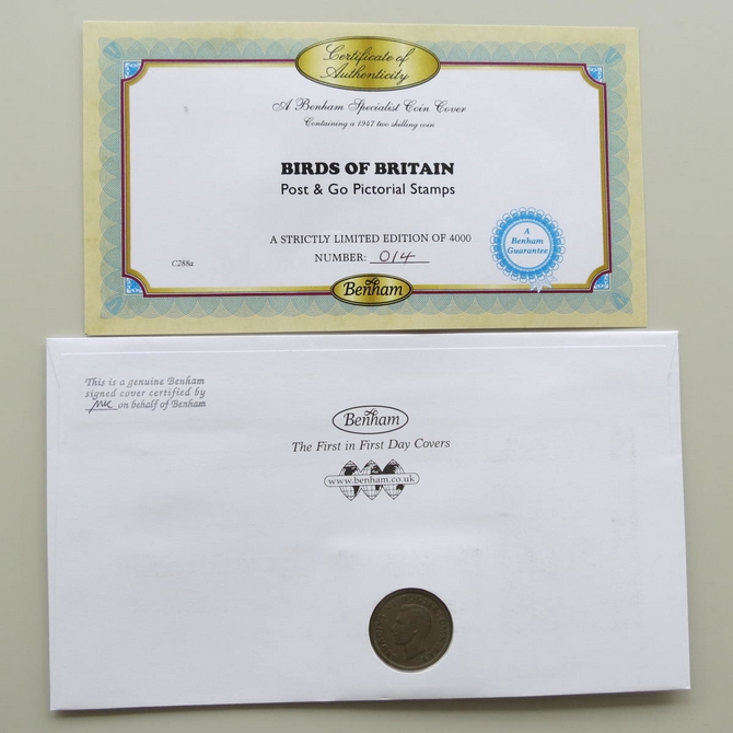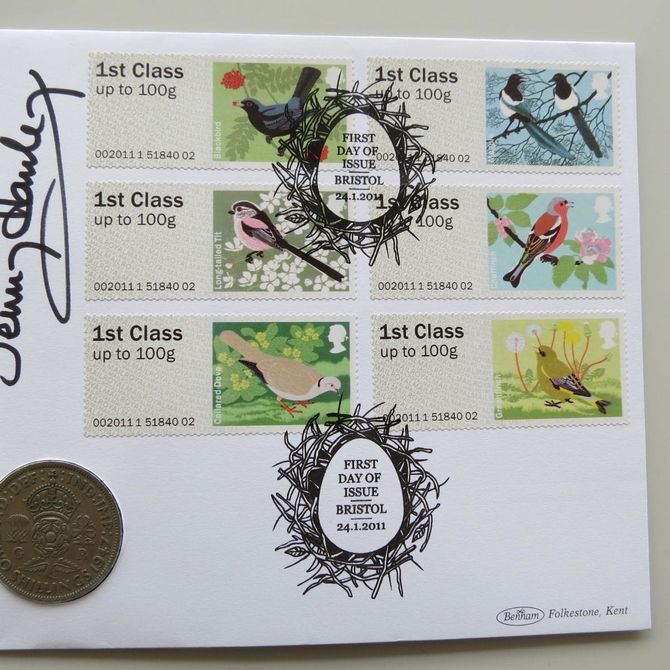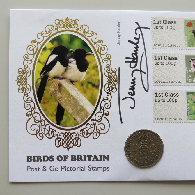 This 2011 Birds of Britain Magpies 2 Shillings coin cover is issued by Benham as UK PNC First Day Covers. FDC hand signed by Jenny Hanley. It hosts a 1947 two shillings coin and Royal Mail stamps. Postmark cancelled dated 24th January 2011.