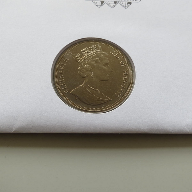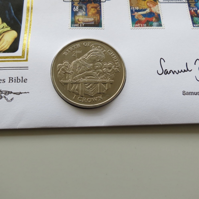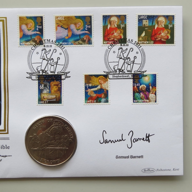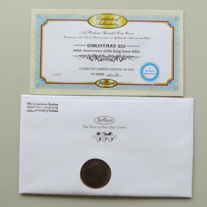 This 2011 Christmas 400th anniversary of the King James Bible Crown coin cover is issued by Benham as UK PNC First Day Covers. FDC hand signed by Samuel Barnett. It hosts a brilliant uncirculated one crown coin by the Isle of Man and Royal Mail stamps. Postmark cancelled dated 8th November 2011.