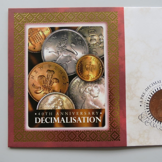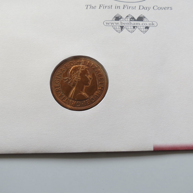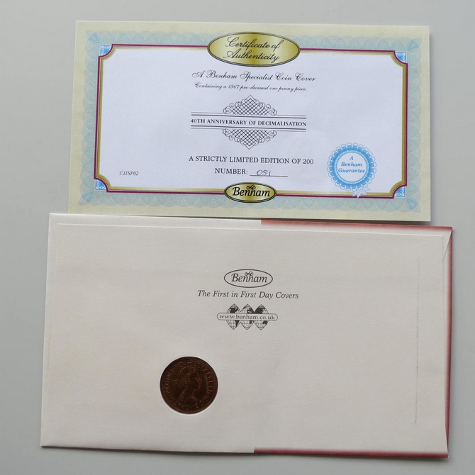This 2011 Decimalisation 40th anniversary one penny coin cover is issued by Benham UK PNC First Day Covers. It hosts a 1967 pre-decimal one penny coin and a Royal Mail stamp. Postmark cancelled dated 15th February 2011.