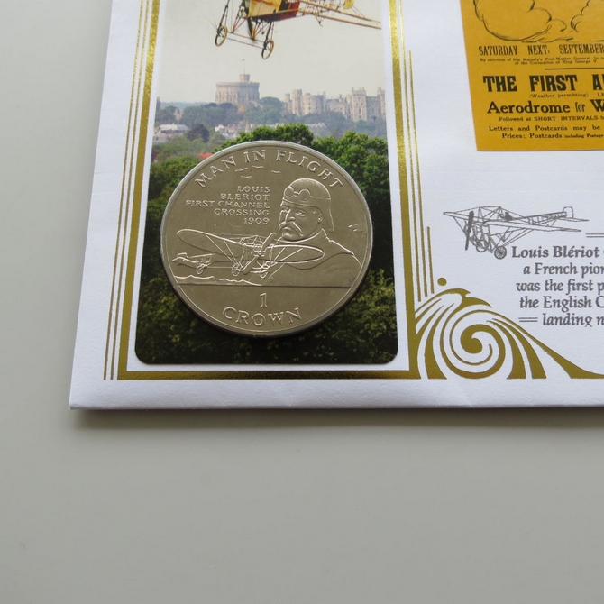 This 2011 First UK Aerial Post Centenary 1 Crown coin cover is issued by Benham as UK PNC First Day Covers. FDC hand signed by Barbara Dickson. It hosts a brilliant uncirculated one crown coin by the Isle of Man and Royal Mail stamps. Postmark cancelled dated 9 September 2011.