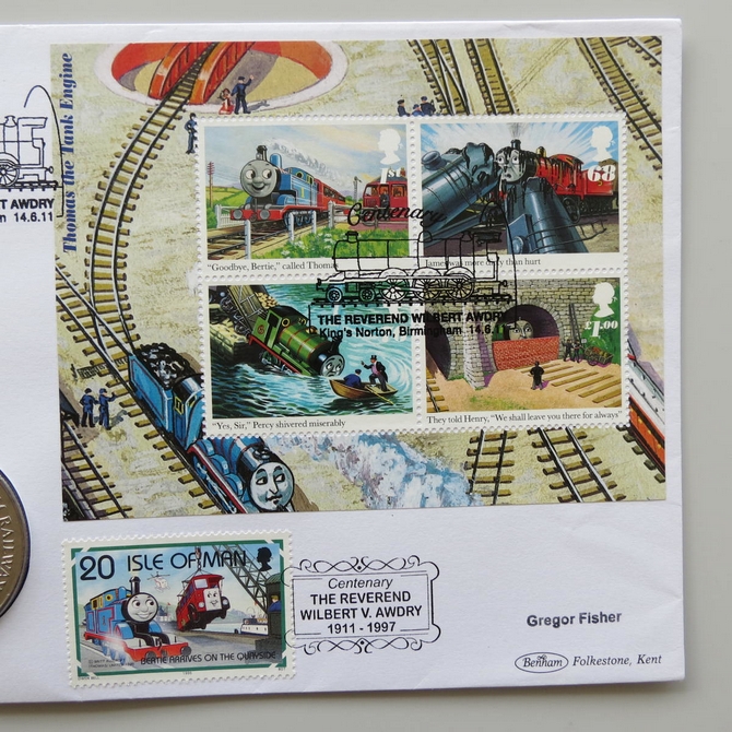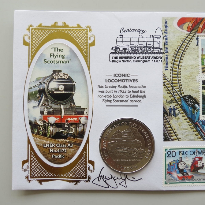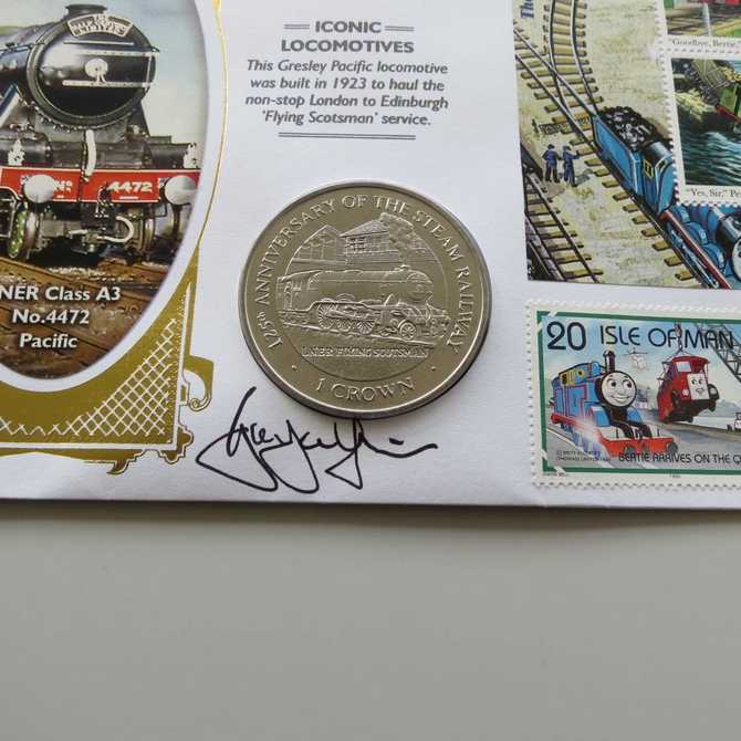 This 2011 Iconic Locomotives The Flying Scotsman Crown coin cover is issued by Benham as UK PNC. FDC hand signed by Gregory Fisher. It hosts a brilliant uncirculated one crown coin by the Isle of Man and Royal Mail stamps. Postmark cancelled dated 14th June 2011.