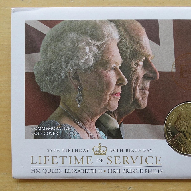 This 2011 Lifetime of Service HM QE II 5 pounds coin cover is a first day cover by Mercury Covers. It commemorates the service and birthdays of both HM Queen Elizabeth II and Prince Philip and hosts a brilliant uncirculated 5 pounds coin by the Royal Mint and Royal Mail commemorative stamp featuring a portrait of the Royal couple. The stamp is cancelled postmark Lifetime of Service London SW1 1st January 2001.
