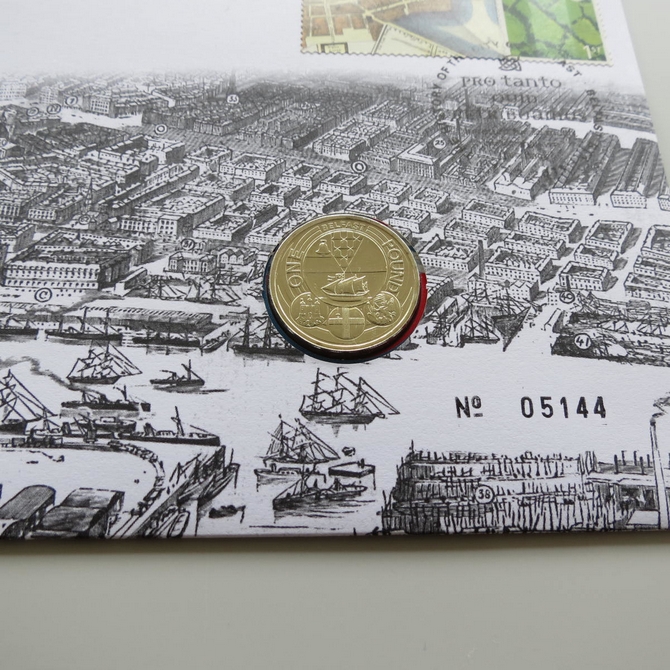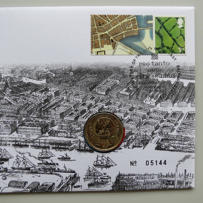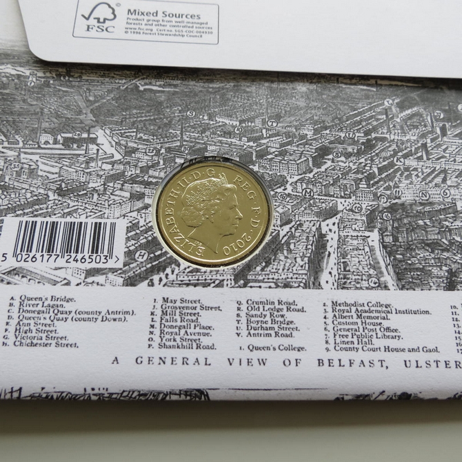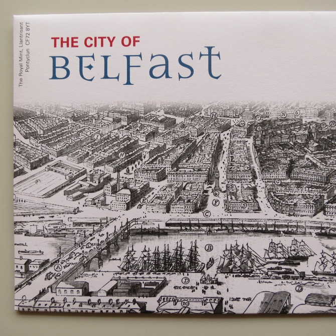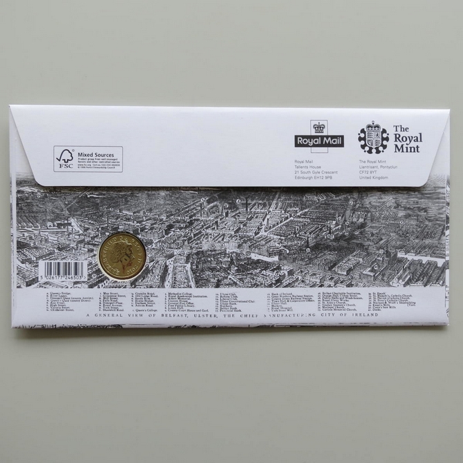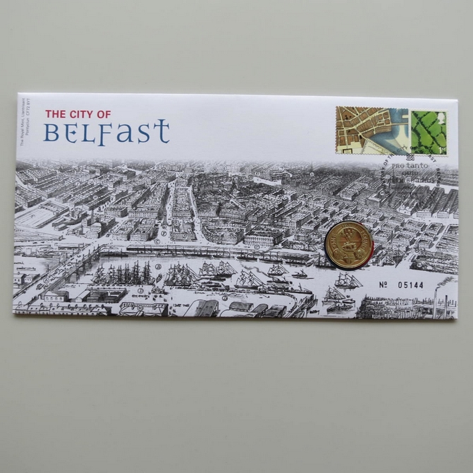 This 2011 The City of Belfast 1 pound coin cover is a Royal Mail first day cover. It celebrates the city of Belfast and hosts a brilliant uncirculated one pound coin by the Royal Mint and Royal Mail commemorative stamp showing a map view of the High Street in the centre of Belfast city. Cancelled postmark The History of the city of Belfast, Belfast BT1 17th March 2011.
