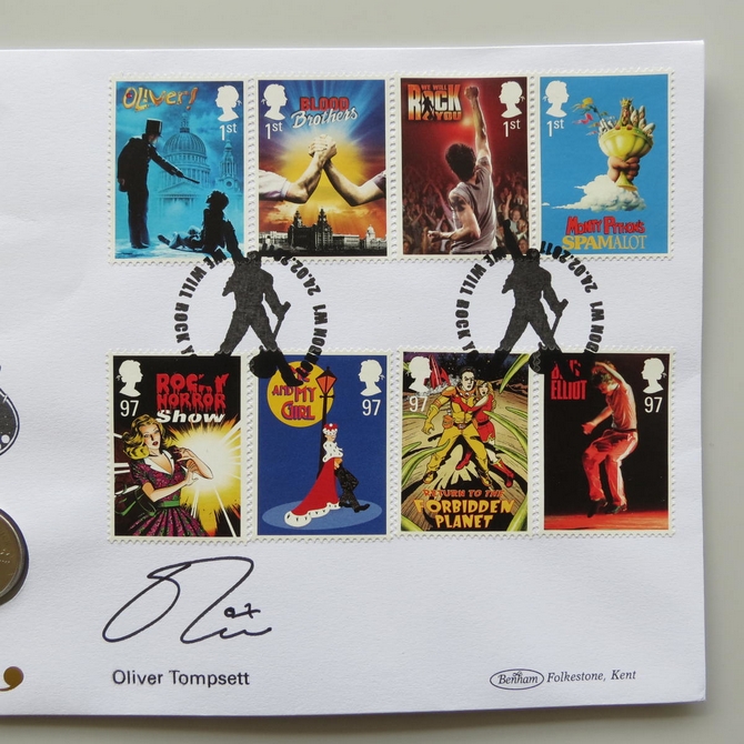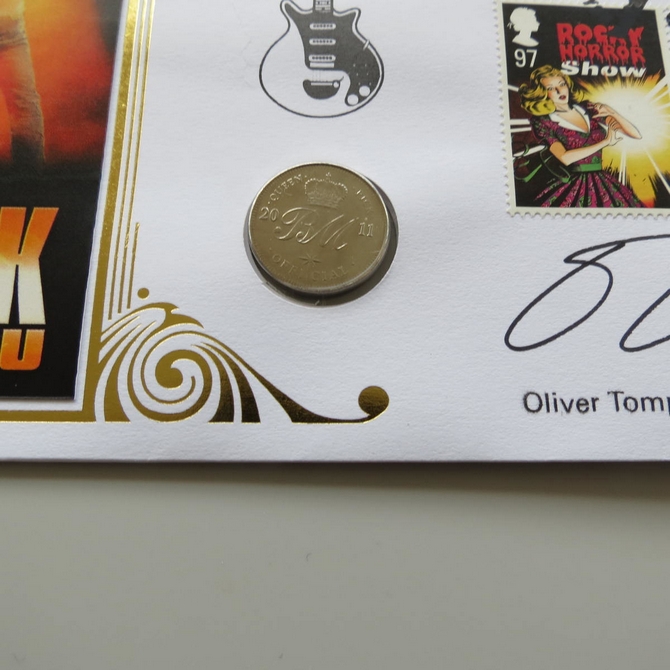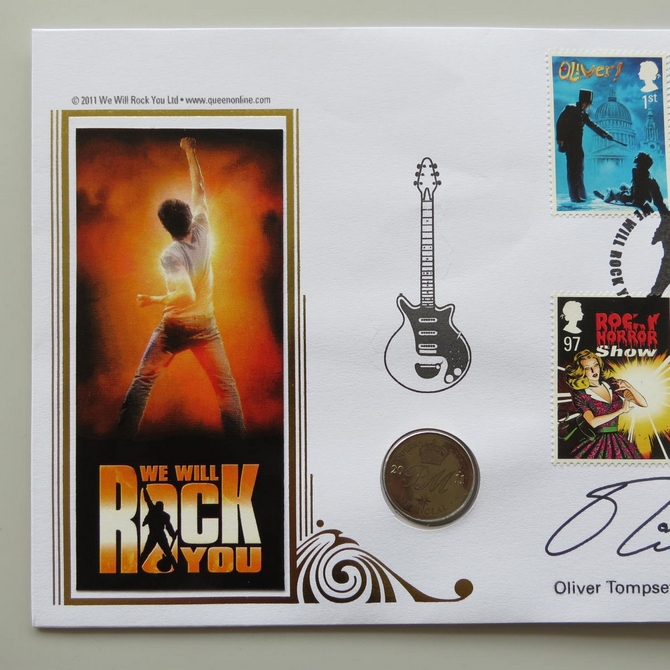 This 2011 We Will Rock You Brian May medal cover is issued by Benham as UK PNC First Day Covers. FDC hand signed by Oliver Tompsett. It hosts a medallion and Royal Mail stamps. Postmark cancelled dated 24th February 2011.