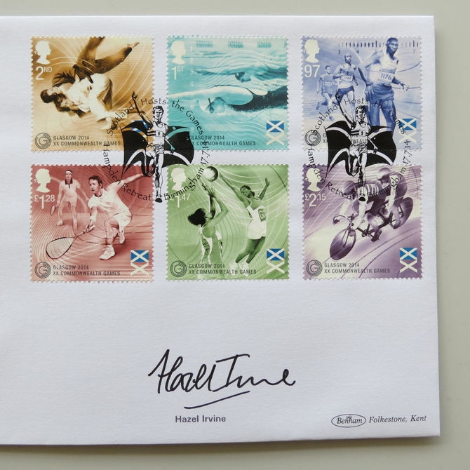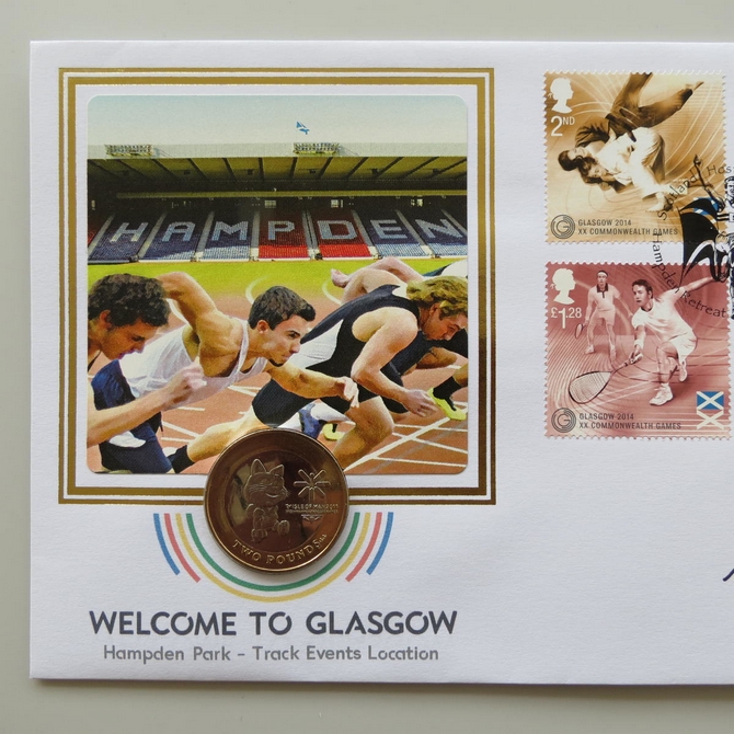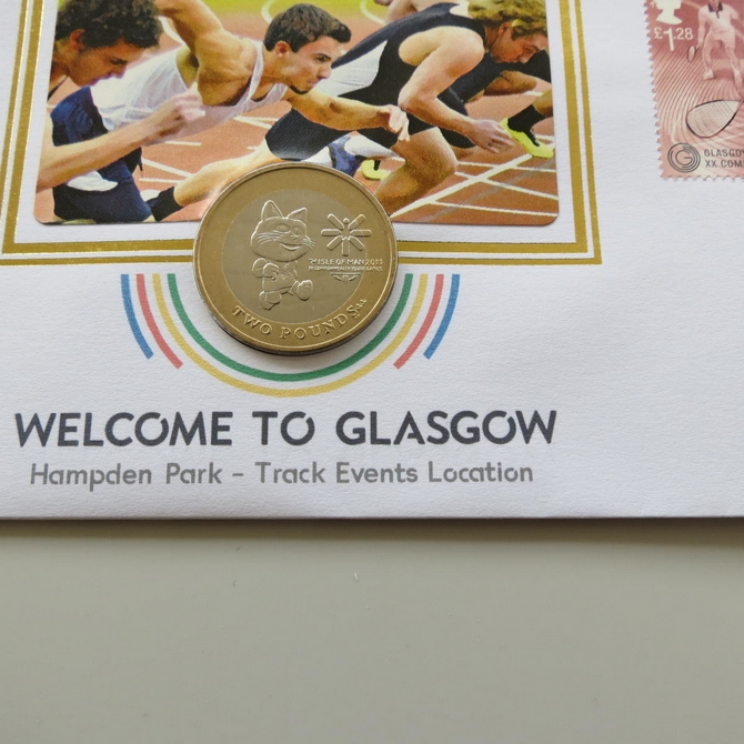 This 2011 Welcome to Glasgow Commonwealth Games 2 pounds coin cover is issued by Benham as UK PNC. FDC hand signed by Hazel Irvine. It hosts a brilliant uncirculated two pounds coin by the Royal Mint and Royal Mail stamps. Postmark cancelled dated 17th July 2011.